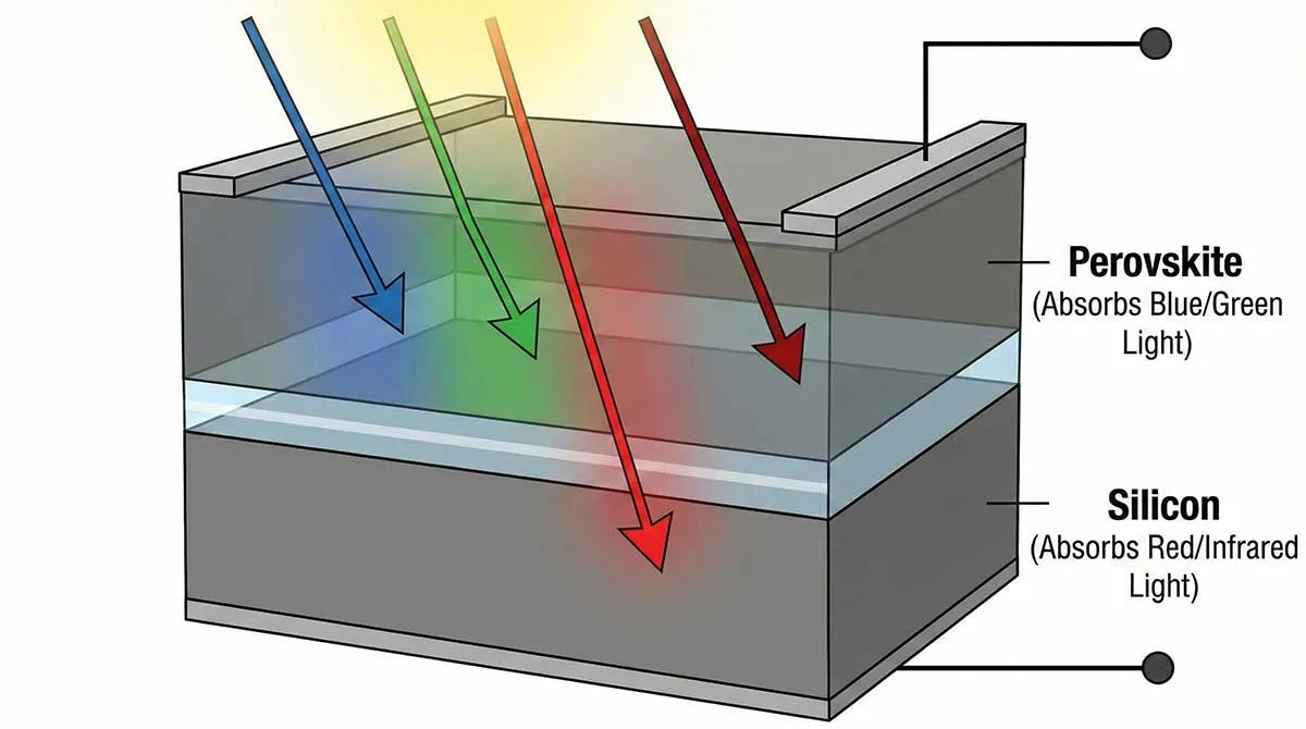 - ชั้นบน (Perovskite) ทำหน้าที่ดูดซับแสงย่านพลังงานสูง (แสงสีน้ำเงินและเขียว)