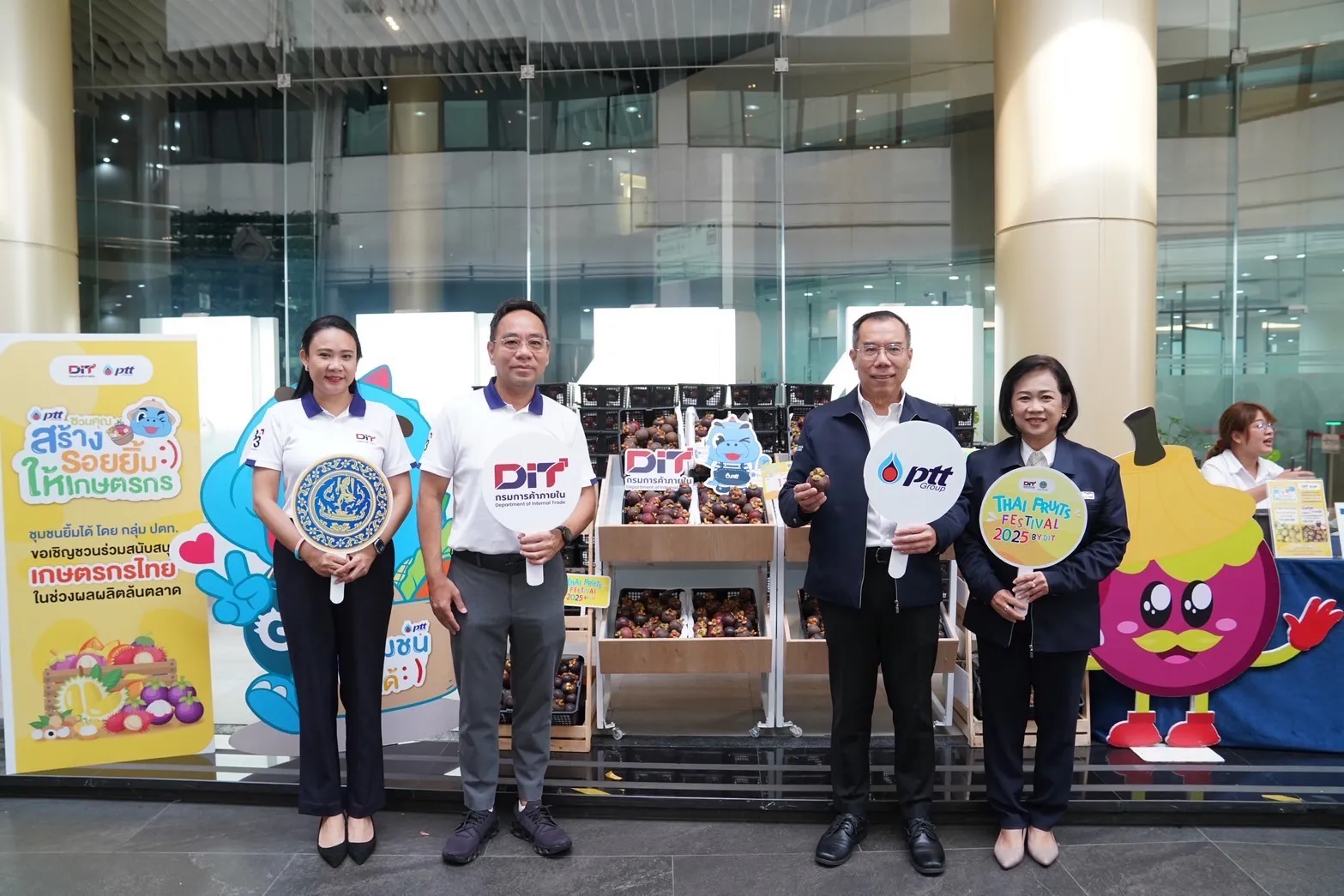 กลุ่ม ปตท. เดินหน้าสนับสนุนนโยบายรัฐเพื่อช่วยเหลือเกษตรกรไทยในช่วงผลผลิตล้นตลาด ตอบรับความร่วมมือ กรมการค้าภายใน (DIT) กระทรวงพาณิชย์ ดำเนินโครงการ “กลุ่ม ปตท. ชวนคุณสร้างรอยยิ้มให้เกษตรกร” โดยเปิดพื้นที่ให้เกษตรกรจำหน่ายผลผลิต ณ อาคาร ปตท. สำนักงานใหญ่ ระหว่างวันที่ 15 – 16 ก.ค. 2568 โดยมีนายวุฒิกร สติฐิต ประธานเจ้าหน้าที่ปฏิบัติการกลุ่มธุรกิจปิโตรเลียมขั้นต้นและก๊าซธรรมชาติ ปตท. (กลางขวา) นางมีนา ศุภวิวรรธน์ ผู้ช่วยกรรมการผู้จัดการใหญ่บริหารชื่อเสียงองค์กรและกิจการเพื่อสังคม ปตท. (ขวา) นายวิทยากร มณีเนตร อธิบดีกรมการค้าภายใน (กลางซ้าย) และนางสาวญาณี ศรีมณี รองอธิบดีกรมการค้าภายใน (ซ้าย) ให้เกียรติร่วม Kick off กิจกรรมสร้างรอยยิ้มในครั้งนี้ และ กลุ่ม ปตท. ยังเป็นพันธมิตรรับซื้อผลผลิตจากเกษตรกรโดยตรงเพื่อมอบให้แก่เครือข่ายในพื้นที่ต่างๆ อาทิ โรงพยาบาล โรงเรียน สถานดูแลผู้สูงอายุ
