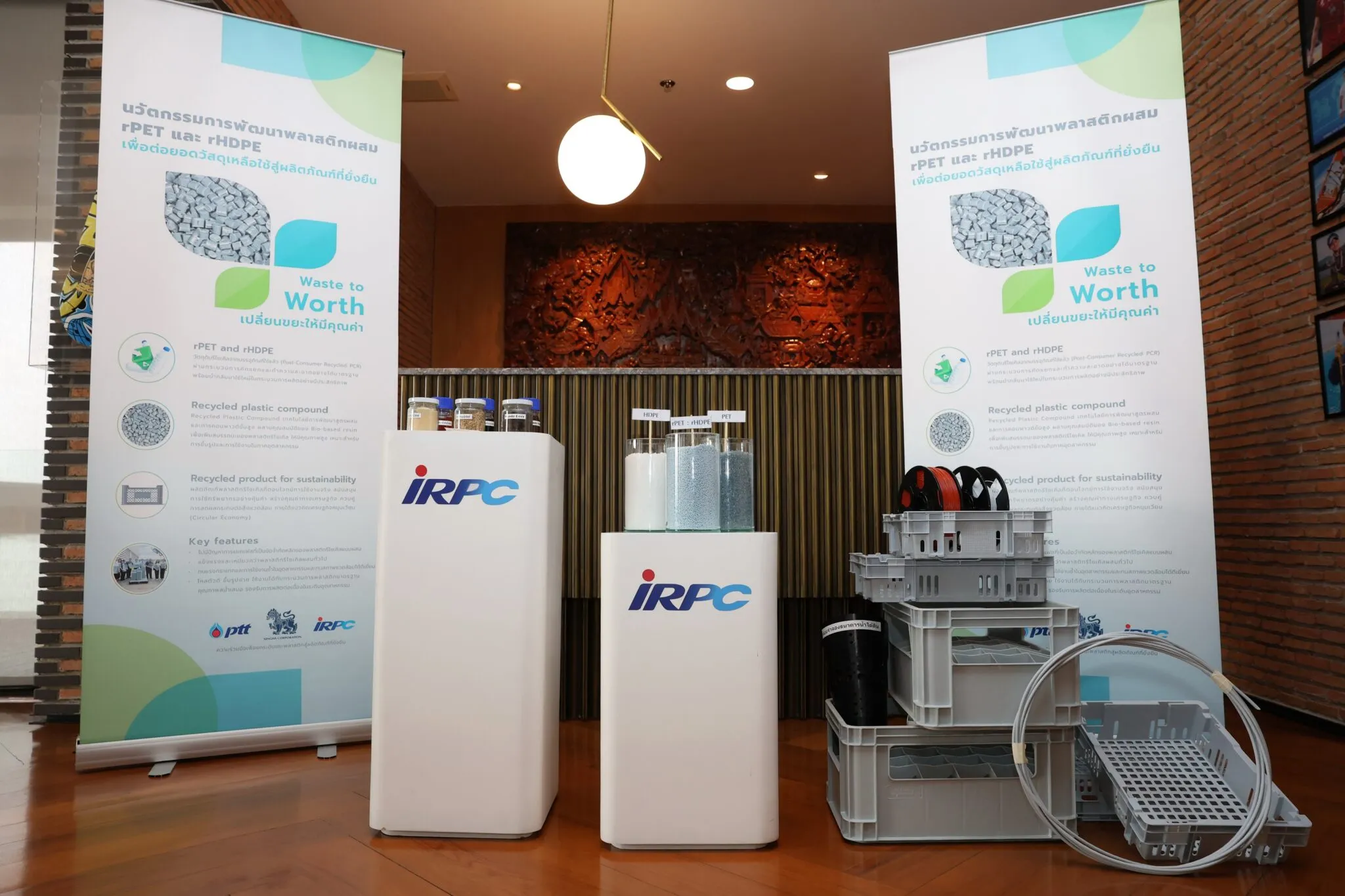 เมื่อเร็ว ๆ นี้ บริษัท ปตท. จำกัด (มหาชน) บริษัท ไออาร์พีซี จำกัด (มหาชน) และ บริษัท บุญรอดบริวเวอรี่ จำกัด ร่วมแถลงความสำเร็จการพัฒนานวัตกรรมพลาสติกรีไซเคิลผสม (rPET และ rHDPE) เพื่อต่อยอดสู่ผลิตภัณฑ์ยั่งยืนตามแนวคิด Circular Economy ที่ลงนามความร่วมมือไปเมื่อเดือนพฤศจิกายน 2566 โดยมี นายประสงค์ อินทรหนองไผ่ ประธานเจ้าหน้าที่ปฏิบัติการกลุ่มธุรกิจปิโตรเลียมขั้นปลาย บริษัท ปตท. จำกัด (มหาชน) (ซ้าย) นายเทอดเกียรติ พร้อมมูล ประธานเจ้าหน้าที่บริหารและกรรมการผู้จัดการใหญ่ บริษัท ไออาร์พีซี จำกัด (มหาชน) (ขวา) และนายปิติ ภิรมย์ภักดี กรรมการรองกรรมการผู้จัดการใหญ่อาวุโส และ ประธานเจ้าหน้าที่บริหาร กลุ่มบริษัทผลิต บริษัท บุญรอดบริวเวอรี่ จำกัด (กลาง) ร่วมพิธี